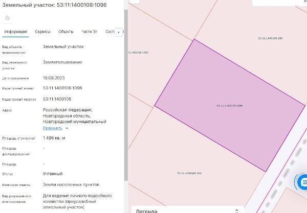 Название: лот № 1 - земельный участок из земель населенных пунктов с кадастровым номером 53:11:1400108:1096, площадью 1495 кв.м