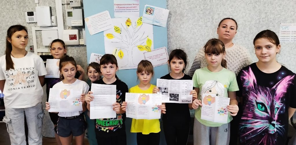 Информационная беседа «Красота различий» в рамках Международного Дня толерантности, по противодействию идеологии терроризма состоялась в клубе «Алмазный» 6 ноября. Участники прослушали притчу о доброте, любви и милосердии, узнали, что обозначает слово «толерантность» на разных языках мира, высказали свое мнение о важности данного понятия в жизни современного человека. Вместе с ведущей ребята сделали символическое «Дерево толерантности», вписав в каждый его листок качества, которыми должен обладать толерантный человек. В конце мероприятия каждый желающий смог проверить, насколько он толерантен, выполнив небольшой тест и сделав соответствующие выводы. Из группы ВК КЛУБ «АЛМАЗНЫЙ
