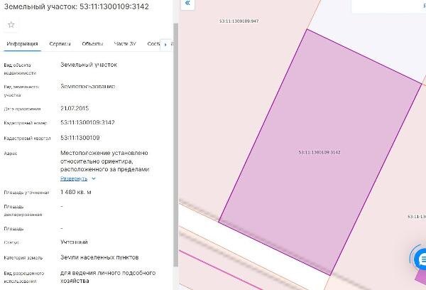 Название: Земельный участок из земель населённых пунктов с кадастровым номером 53:11:1300109:3142, площадью 1500 кв.м, расположенный по