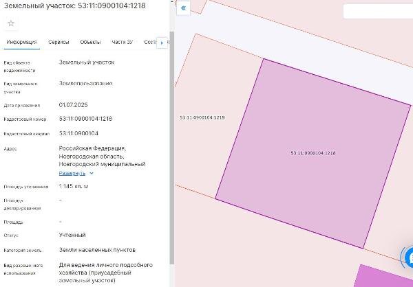 Название: Земельный участок из земель населённых пунктов с кадастровым номером 53:11:0900104:1218, площадью 1145 кв.м, расположенный по