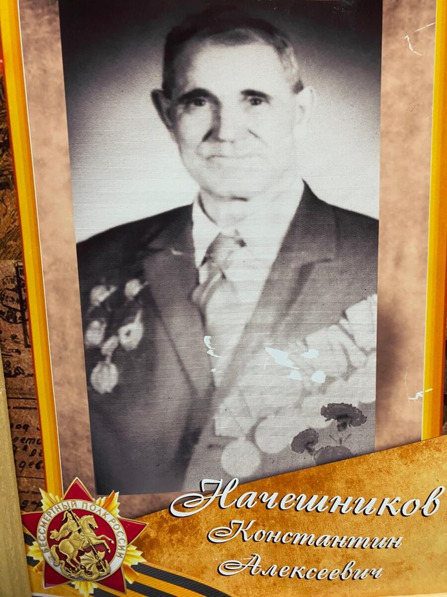 «Человек без памяти прошлого, что дерево без корней», — так гласит пословица. 9 мая — тот самый день, когда стоит вспомнить своих родных-ветеранов Великой Отечественной войны. Слушая рассказы о военном прошлом своих предков, я понимаю, что только благодаря их самоотверженному подвигу возможно моё будущее. Поэтому я с гордостью могу сказать, что мой прадед Кунавин Валентин Дмитриевич и прапрадед Начешников Константин Алексеевич — участники Великой Отечественной войны. Мне не довелось их увидеть. О судьбе моего прапрадеда Константина Алексеевича мне рассказала моя бабушка, его внучка.