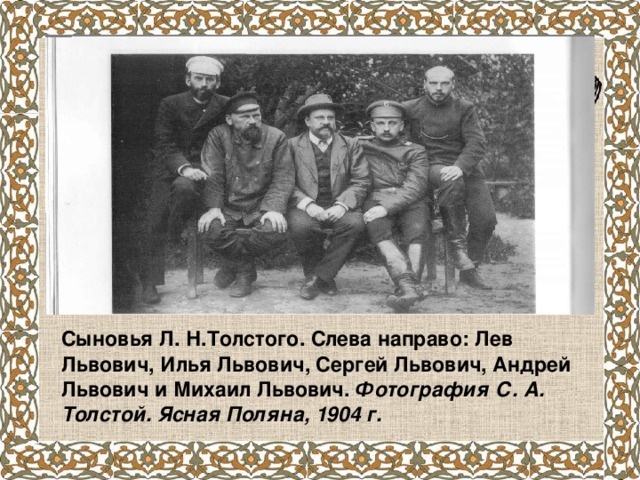 Сергей (1863—1947), композитор, музыковед. Лев (1869—1945), скульптор. Андрей (1877—1916), по чиновничьей линии пошел. Михаил (1879—1944), музыкальный деятель.