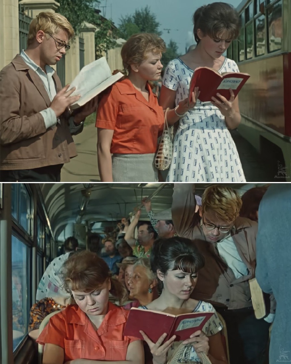 В фильме между этими кадрами меньше минуты, в реальности — 8 месяцев. В 1965 году, во время съемок новеллы «Наваждение» из фильма Леонида Гайдая «Операция „Ы“ и другие приключения Шурика» киноконцерна Мосфильм, расписание съемок было выстроено так, что два эпизода, которые в фильме идут друг за другом снимались с большой разницей во времени. Подругу Лиды, уснувшую в трамвае играла Людмила Ковалец. В течение многомесячного перерыва актриса забеременела. И во втором эпизоде ее снимают уже только по грудь, чтобы скрыть живот. Внимательные зрители также заметили, что у Натальи Селезневой (Лиды) другая сумочка. А у Александра Демьяненко (Шурик) другая книга (страницы желтые, а не белые, как в предыдущем кадре). #История_факт