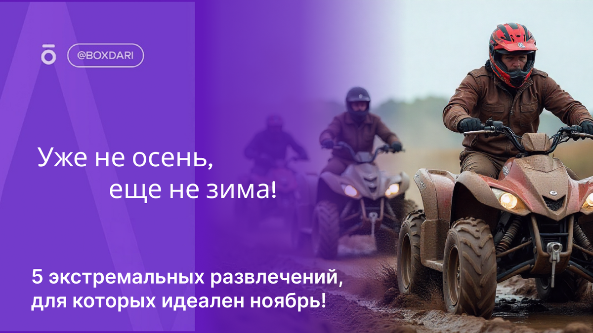 Почему это идеально в ноябре: Осенняя грязь — это не проблема, это трасса! Там, где летом была пыльная грунтовка, теперь появляются липкие колеи, глубокие лужи и настоящие грязевые ванны. Катание на квадроциклах в ноябре превращается из простой прогулки в захватывающее преодоление. Это настоящее испытание на прочность и для техники, и для водителя.