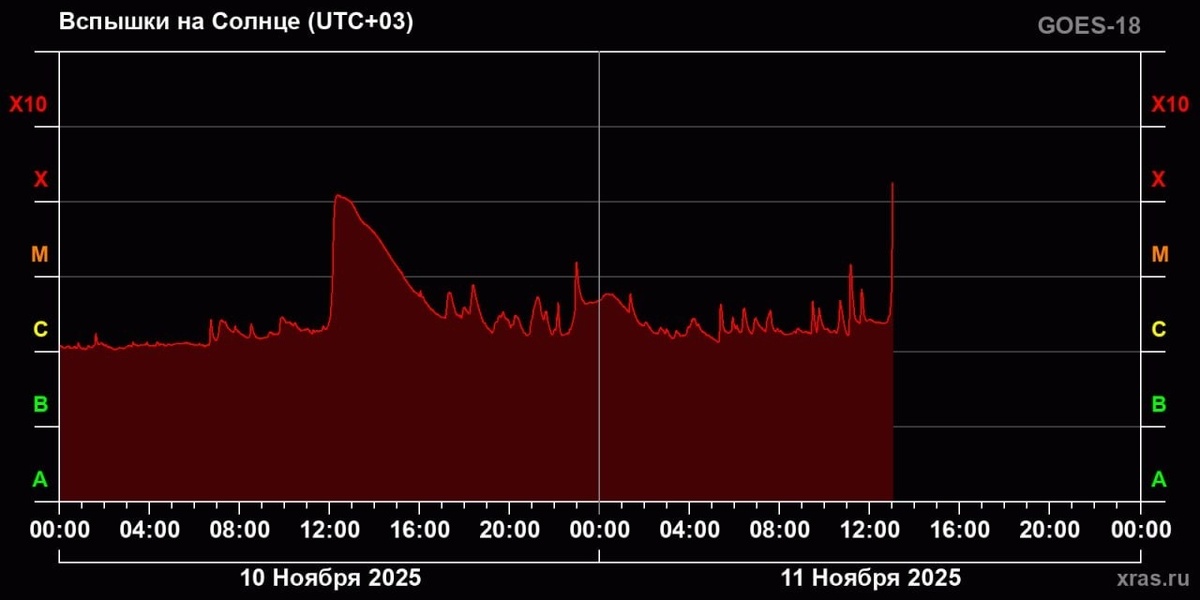 За прошедшие сутки произошло 15 вспышек, на Земле ожидаются сильные магнитные бури. На Солнце происходит сильнейшая в текущем году вспышка, сообщили в Лаборатории солнечной астрономии. Ее балл составляет Х5.1. Между тем, согласно прогнозу, 11-12 ноября на Земле ощутят последствия двух предыдущих сильных выбросов солнечной плазмы, произошедших на Солнце 9 и 10 ноября. Между ними будет интервал в несколько часов. Ранее учёные предполагали, что сильнейшая магнитная буря произойдёт 7 ноября, но тогда плазменные облака зацепили планету лишь краем, и волнения магнитосферы оказались слабыми. В этот раз ожидаются бури уровня G4 — такие в этом году были 1 января и 1 июня, а бури высшего 5 уровня происходили в мае. Вскоре астрономы сделают расчёт по последней мощнейшей вспышке.