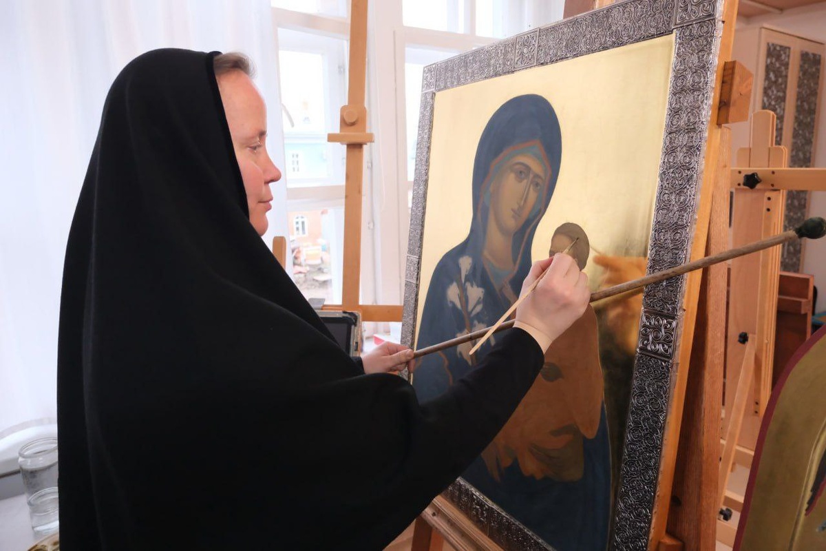 Дивеевские сестры любят писать иконы Божией Матери. Особое место в их творчестве занимает икона «Умиление» Серафимо-Дивеевская. Взаимоотношение души с Богом – мистическая тема этого образа. Сейчас в иконописной мастерской на мольберте монахини Феофаны икона Божией Матери «Неувядаемый Цвет». Это один из самых живописных и почитаемых образов Богородицы, оригинал которого был создан греческими мастерами после падения Византийской империи в конце XVII века в Константинополе, а затем распространился по всему православному миру. Тема этого иконописного изображения восходит к словам канона Пресвятой Богородице, который читается в Субботу Акафиста. В нем есть такие слова: «Радуйся Богоневесто... Цвет неувядаемый процветший».