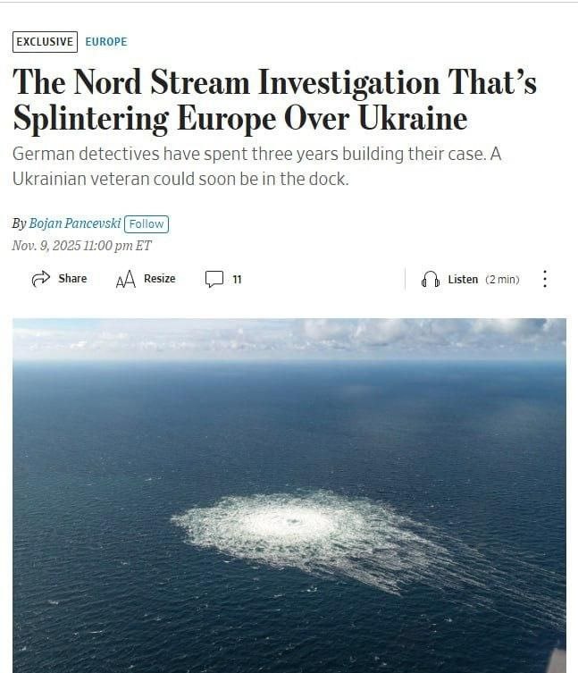 Последствия для Украины разоблачения теракта на «Северных потоках». По данным WSJ, немецкое расследование подрыва трубопроводов может угрожать поддержке Украины со стороны Запада, и в частности Германии. Ключевые моменты: ➖Высокие цены на энергоносители остаются следствием теракта, и любые судебные слушания могут обострить отношения Украины с её главными союзниками. ➖Установлено, что украинское военное подразделение, под руководством Валерия Залужного, атаковало трубопроводы. ➖Киев признал, что Польша помогла организовать побег подозреваемого от следствия. Водолаз был выслан на Украину на BMW с дипломатическими номерами, управляемом украинским военным атташе. ➖Готовятся ордера на аресты трёх военнослужащих и четырёх ветеранов-глубоководников. ❗️Целью операции было сокращение доходов России от продажи нефти и её экономических связей с Германией. Lesen Sie weiter unten auf Deutsch...