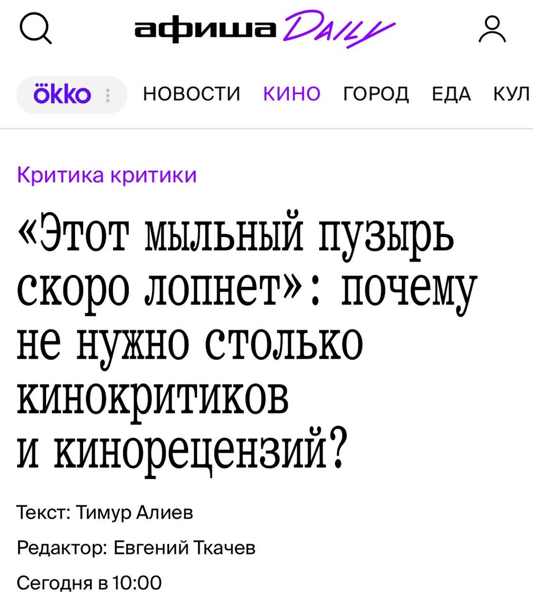 С интересом наблюдаем за пылающем срачем в среде российских кинокритиков. Собственно, кинокритик Тимур Алиев, тщательно перечисливший все свои регалии в начале колонки, наезжает на телеграмеров-критиков и запрещает им таковыми себя считать. Коллеги по телеграму восстали и грянул бой.