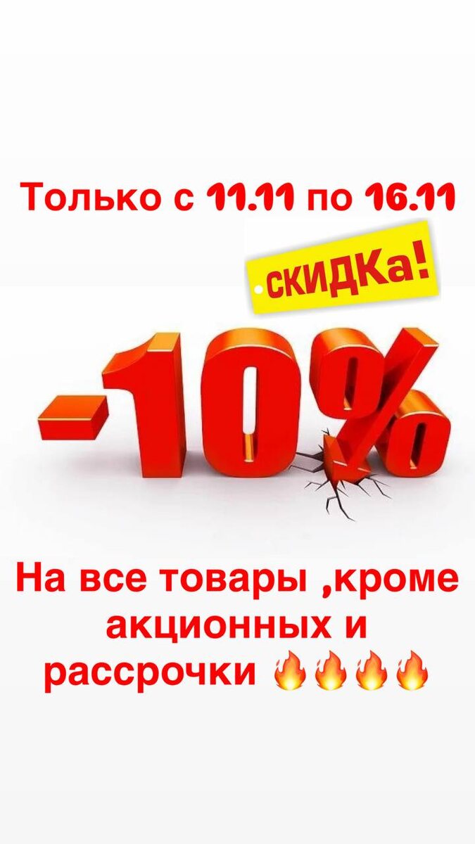 Друзья у нас есть хорошая новость 👆🏻👆🏻👆🏻👆🏻 Только с 11.11 по 16.11 мы обрушим цены на все товары 🔥🔥🔥🔥🔥🔥🔥 *Скидка не суммируется с другими акционными предложениями и рассрочкой