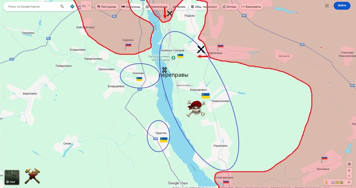 В ответ на пост Купянск Узловой. Противник заперт в прибрежной полосе и прижат к Осколу. Переправы разбиты, на них идет бойня хохлов нашими дронщиками, месть за геноцид русских в 2022 году при захвате Купянска украинцами. Укровоены строят плоты. Гарнизон ВСУ быстро худеет от потерь и от сбежавших. Вся пойма непроходима для тяжелой техники. Справедливый конец для укронелюдей. схемы и карты