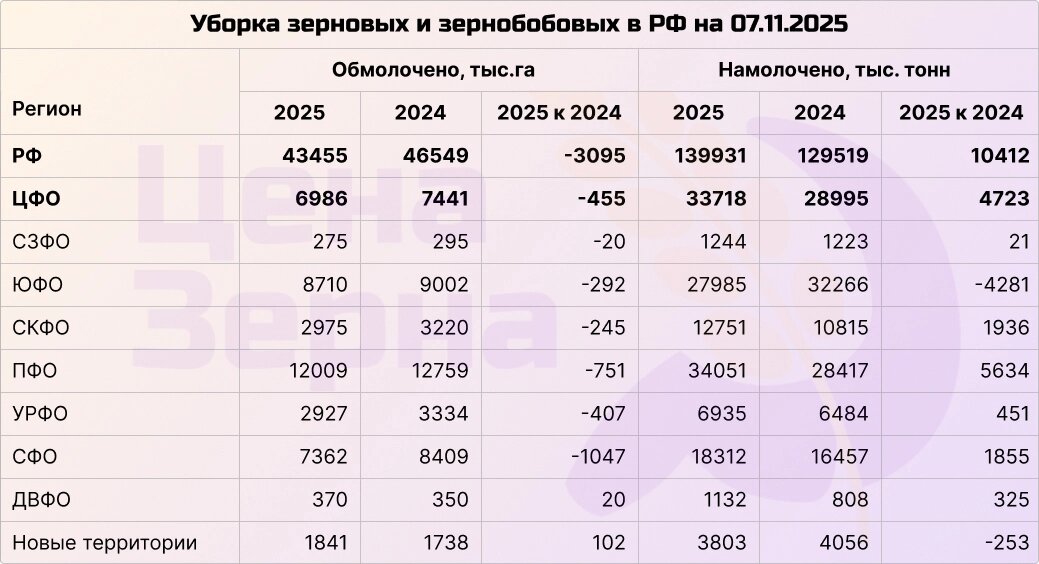 Производство зерна в РФ практически достигло 140 миллионов тонн в бункерном весе. Убрано около 96% посевных площадей. Однако темпы сборки замедлились, так как многие аграрии уже готовятся к следующему сезону, убирая поздние культуры — сою, кукурузу и подсолнечник. В активной фазе находятся только регионы Дальнего Востока. Остальные области завершили сбор более чем на 90%. Средняя урожайность выросла почти на 4,5 ц/га по сравнению с прошлым годом и составляет 32,2 ц/га. Уборка в этом сезоне практически завершена. Намолочено более 94 миллионов тонн пшеницы, что значительно превышает результат прошлого года — на 7 миллионов тонн. В связи с этим аналитические центры, такие как ИКАР и СовЭкон, повысили прогнозы по экспорту пшеницы. Внутренний спрос будет существенно покрыт, что является положительным сигналом для экспортеров зерна. Ячмень практически полностью убран с полей, осталось не более 3%. Средняя урожайность превышает 30,5 ц/га, а общий намолоченный объем уже превысил 20,5 миллионов
