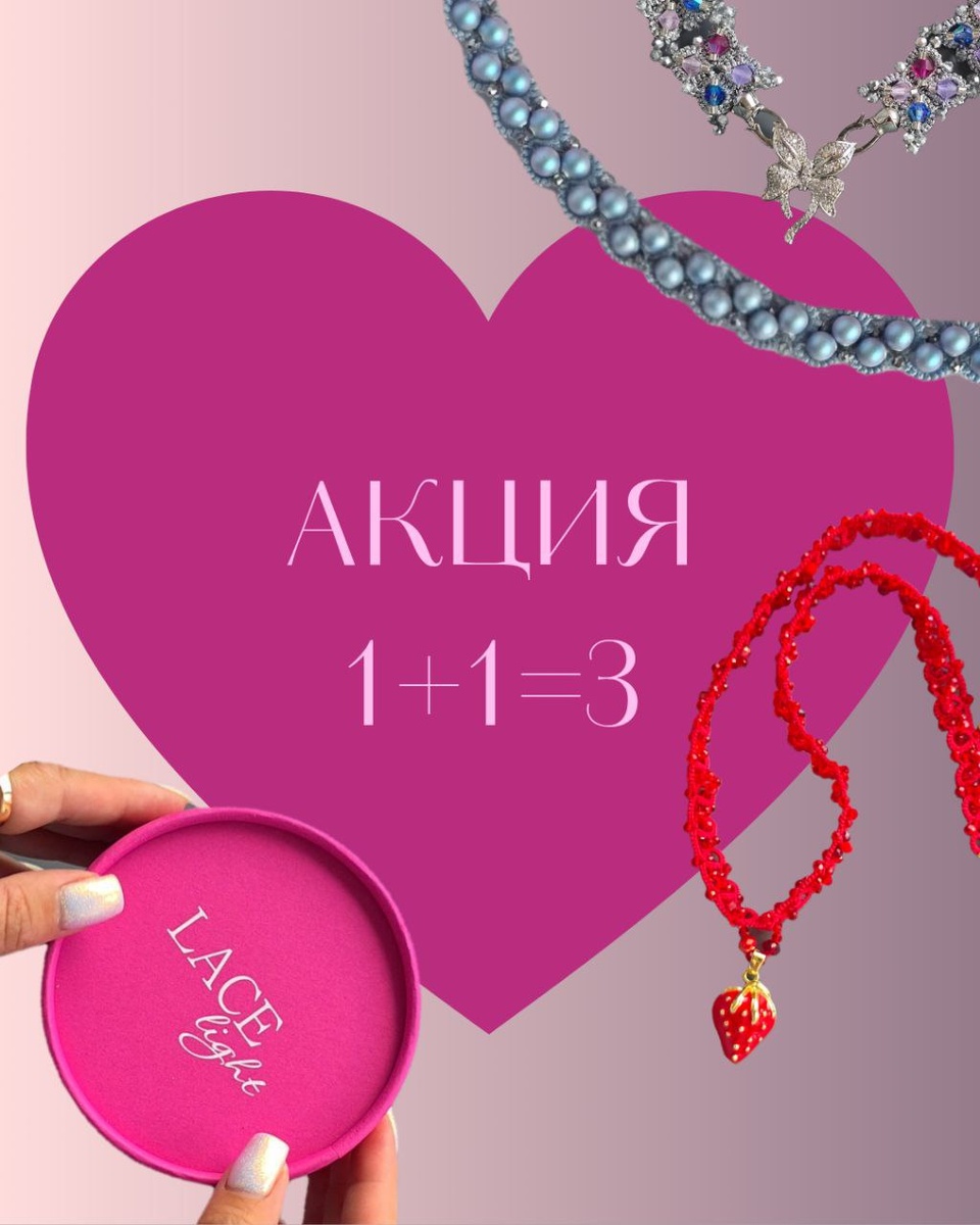1+1=3 🫰🌈🎈 такое случается очень редко. Вы покупаете 2 украшения, а третье я дарю вам в подарок. Акция действует на украшения из наличия, которые представлены на сайте lacelight.ru 💫 Как оформить заказ? Выбираете 3 изделия, делаете скриншот и присылаете мне в личные сообщения @lacelight. На сайте к сожалению данную акцию сделать нельзя. В этой акции не участвуют Новогодние боксы, но подарочки вы точно от меня получите🥰 Акция действует 11, 12 и 13 числа.
