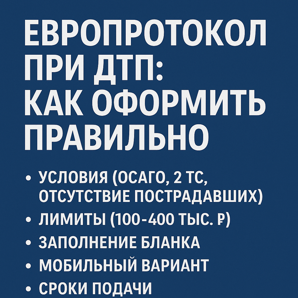Европротокол при ДТП как оформить правильно — это не просто заполнение бланка, а комплекс действий, требующих внимательности и знания правил. При обоюдном согласии сторон, отсутствии пострадавших и соблюдении лимитов по сумме ущерба, он позволяет быстро урегулировать последствия аварии без участия инспекторов.