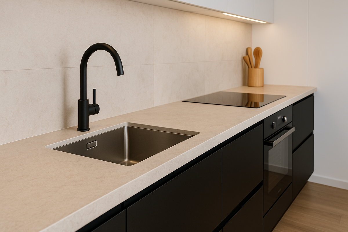- ЛДСП/пластик: дружит с врезными мойками; тщательно герметизируйте вырез, кромку и отверстия под смеситель/дозатор.