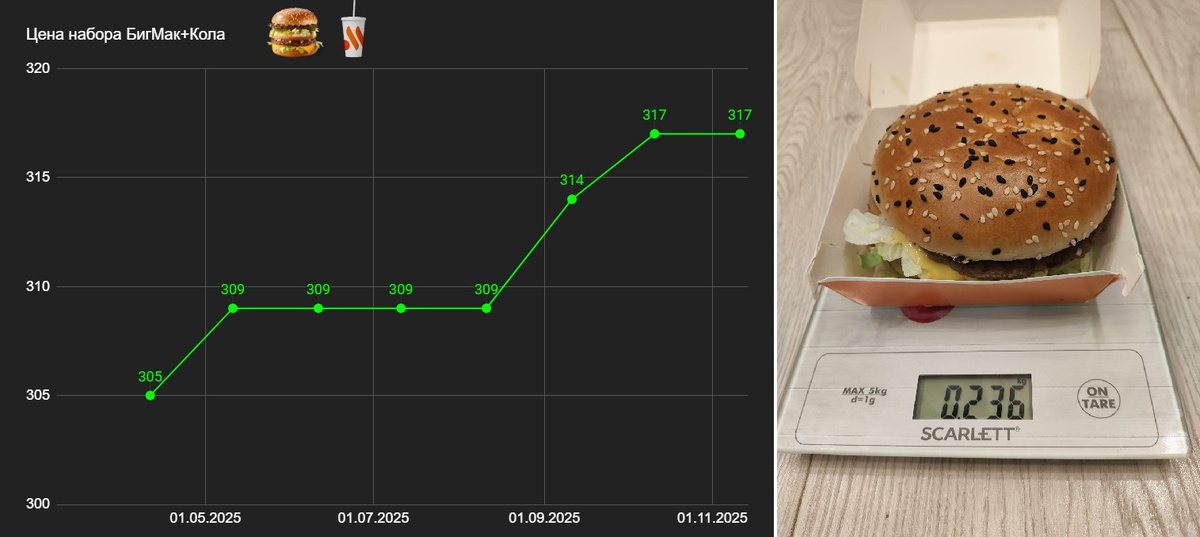 Я экспериментально проверяю "Правило-4%", согласно которому можно накопить 300 ежемесячных расходов, и этих денег должно хватить на всю жизнь. Ведь при дозированном изъятии сбережения способны сами себя воспроизводить и не снижаться даже с поправкой на инфляцию. Это восьмой месяц эксперимента, в рамках которого я положил на отдельный счёт сумму, равную 300 наборам "Бигмак-Кола", и теперь ежемесячно снимаю с него средства. Подставьте вместо бигмаков что угодно - коммуналку, подписки на сервисы или все расходы на жизнь. Суть не поменяется, вопрос лишь в размере стартового капитала. Набор стоит 317 рублей (216+101), как и в прошлом месяце. А всего рост цены +4% за 8 месяцев. За шринкфляцией тоже слежу. Вес изделия существенно не меняется в этом году (216-220г - ведь коробка весит 20г). Вывожу второй месяц подряд средства за счет продажи исключительно облигаций и фонда ликвидности, акции не трогаю. Это связано с тем, что доля акций в портфеле 68%, это ниже целевого значения 70%. Акции в по