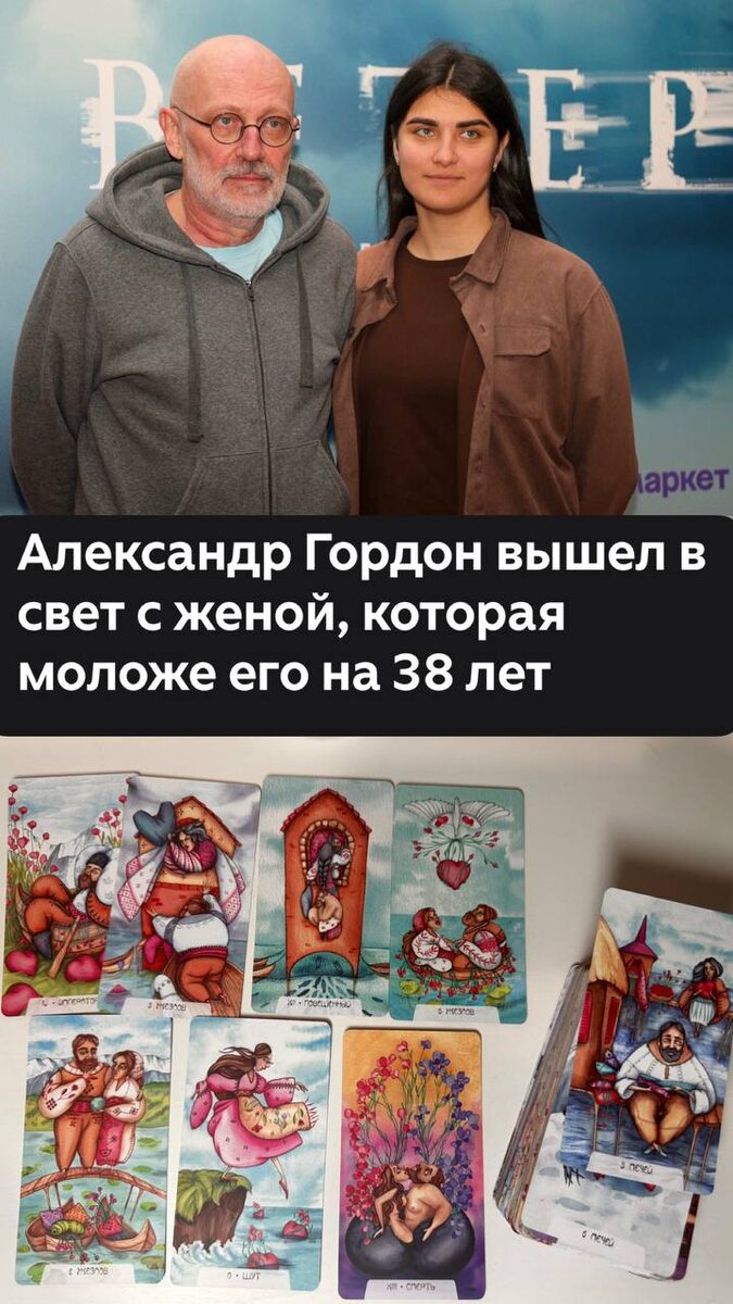 Тихо и почти незаметно, будто за хлебом в магаз, «вышли в свет» Гордон со своей попыткой номер 5 пятой женой. Вот смотрю на них и офигеваю, все-таки такого разрыва мезальянс — не моё. Как поживают молодые? Не без «огонька», строит батька Гордон свою красавицу (Император, 5 жезлов), скандалят иногда; чувствует Софа, что не на такие отношения она подписывалась (Повешенный), пришлось пожертвовать ей чем-то (лучшими годами не иначе?) 😊На чувства у Александра карта хорошая — 8 жезлов, еще горит огонь желания (ну еще бы 😏) 😊А вот у молодой красотки все сложно—аркан Повешенный очень обременяющий и тягостный, прошел, видать, запал, но терпимо, да и выбрала она его за возможности (2 жезлов). Обещал, наверно, много чего. 💦В перспективе—угасание чувств (Смерть), что предсказуемо… Саша «не первый раз замужем», вот только проблема сейчас даже не в этом, а в ребеночке (Шут). Да-да, еще родит поди🙈