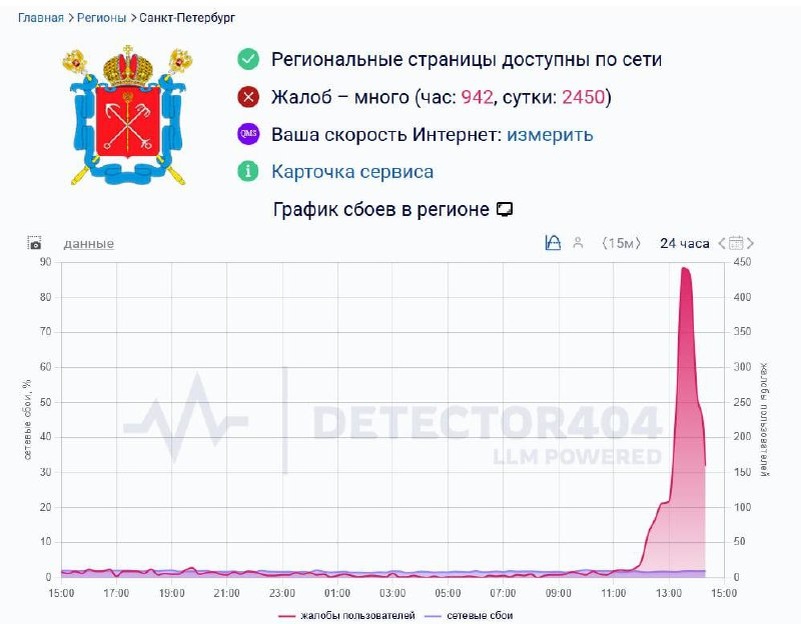 В Санкт-Петербурге произошёл масштабный сбой мобильного интернета — пользователи сообщают, что не открываются сайты, мессенджеры, банковские приложения, а также сервисы доставки и такси. По словам очевидцев, связь исчезла у всех крупных операторов почти одновременно. На данный момент функционируют только «Госуслуги» и ограниченный список государственных сервисов, входящих в «белый список» при отключениях связи.