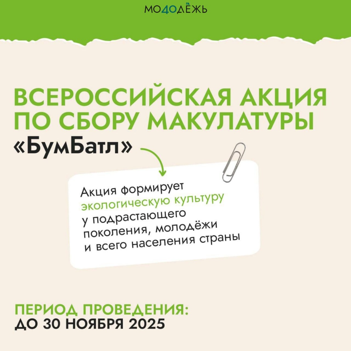 Пора сдавать макулатуру! 🌱 #Молодёжь40, присоединяйся к Всероссийской акции по сбору макулатуры «БумБатл». «БумБатл» даёт возможность проявить заботу о природе через сбор и сортировку бумаги. Но, как и любой батл, — это ещё и соревнование по количеству собранной макулатуры, где можно побороться за первенство в командном или индивидуальном зачёте, а также помочь своему региону стать лучшим по итогам года! 💚 Изучайте карточки и присоединяйтесь к акции до 30 ноября. #Молодёжь40 #Бумбатл