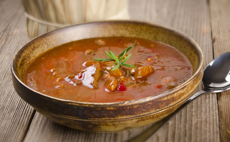 На сухой сковороде (чугунной или с антипригарным покрытием) обжарьте, перемешивая, муку до бежевого цвета, затем влейте 2 половника горячего мясного бульона и перемешайте.