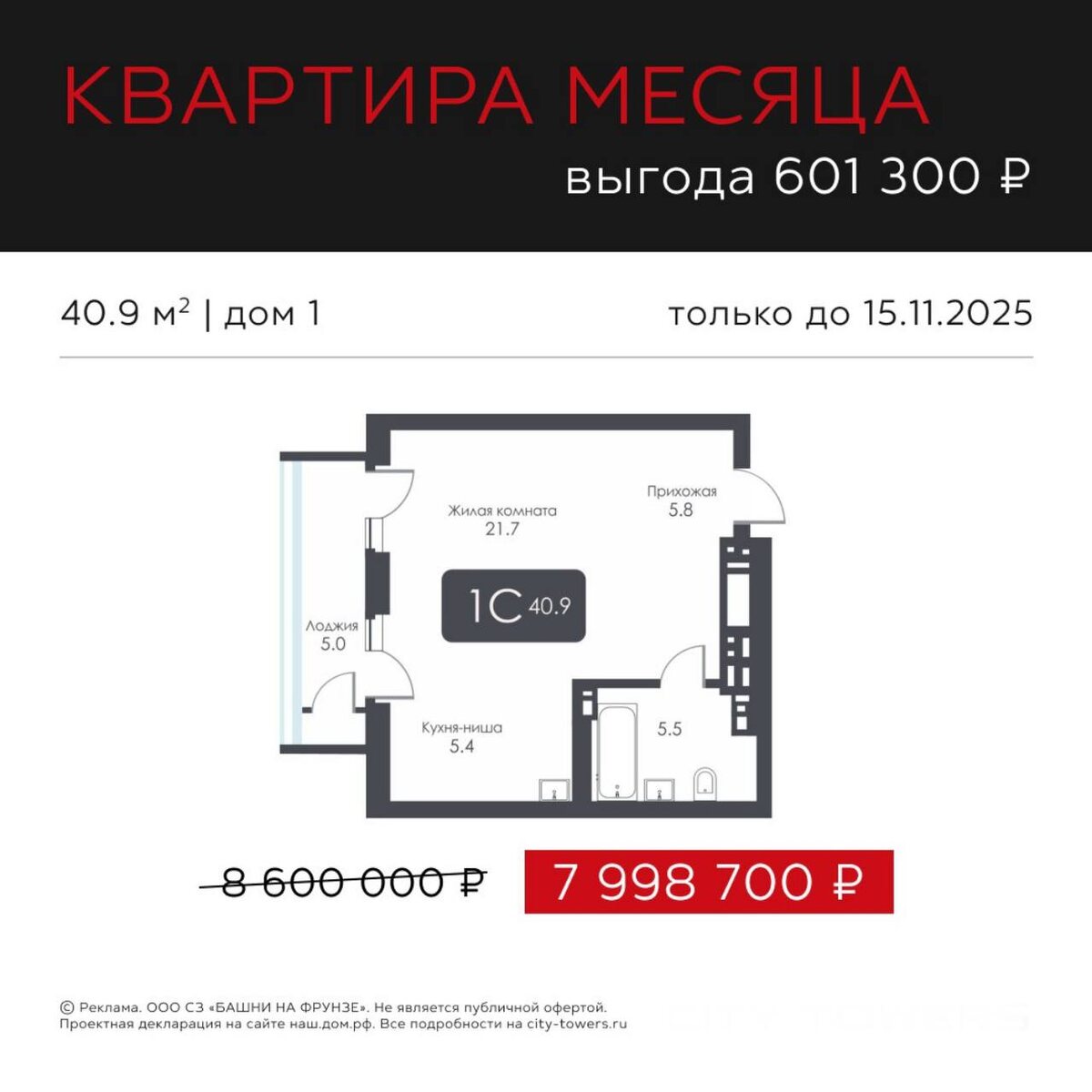Квартира со скидкой 601 300 ₽ в ЖК Бизнес класса в центральной локации города🔥 Просторная однокомнатная студия 40,9 м² на пятом этаже подойдет одному человеку или молодой паре. В ней — эргономичная планировка, санузел 5,5 м² и длинная лоджия. Акция - первый взнос по рассрочке 20% , вместо 30% и платежи в месяц 50 тыс. Ставь «+», если интересно👇