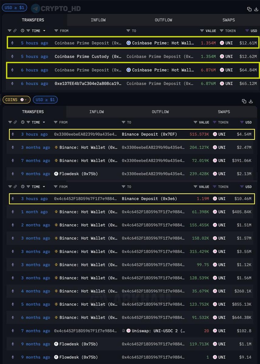 🐋 Крупные инвесторы теперь сливают #UNI ? ➥ Два кошелька, связанные с Uniswap, отправили 8,23m UNI ($77,45m) на Coinbase Prime. Эти токены поступили со старого инвесторского адреса «Uniswap: Investors», созданного еще 5 лет назад. Кошельки: 1 , 2 ➥ Еще один кит перевел 1,71m UNI ($15m) на Binance, зафиксировав убыток в $1,44m (-8,8%). Эти монеты он накапливал с февраля по октябрь 2025 года. Кошельки: 1 , 2 Ранее: - киты накапливают UNI - мнение CEO CryptoQuant - предложение CEO Uniswap Crypto Headlines