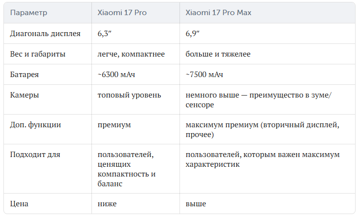 Так что базовая производительность у них очень близка — различия лежат в деталях: дисплей, батарея, габариты, камеры, дополнительные фишки. Xiaomi 17 Pro: Xiaomi 17 Pro Max: Вывод: Если хочется более компактную модель — 17 Pro будет предпочтительнее. Если важен большой экран — 17 Pro Max. Обе модели предлагают высокий класс дисплея: LTPO AMOLED, 120 Hz, высокая яркость (до ~3500 нит).