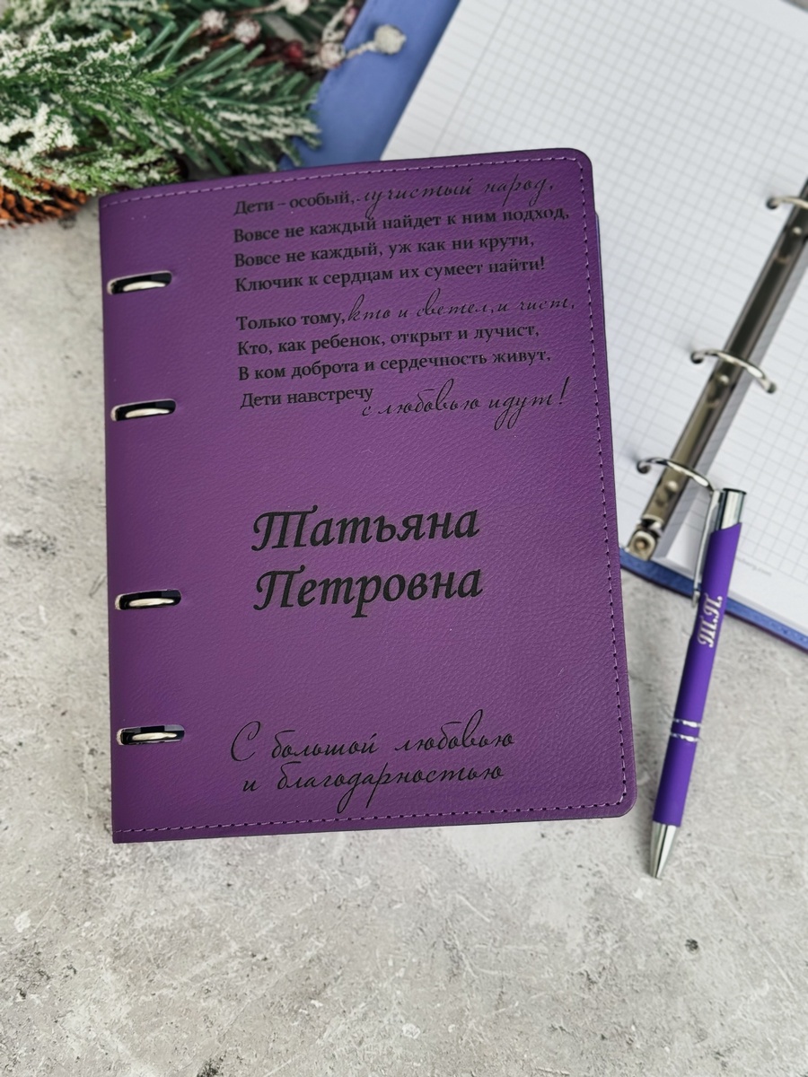 📘 Блокнот на кольцах + ручка с именной гравировкой 🎁 Идеальный подарок для учителя ко Дню учителя или любому другому важному событию. ✨ Что входит в набор: - Блокнот на кольцах из качественных материалов (страницы легко менять и добавлять). - Металлическая ручка с именной гравировкой. 👌Персонализация: имя, инициалы, фраза или пожелание на обложке и ручке. 🌿 Такой подарок будет не только практичным, но и очень трогательным — учитель точно оценит вашу заботу и внимание. 📌 Доступные цвета: фиолетовый, зелёный, коричневый, красный, тёмно-синий, чёрный. 📦 Возможна подарочная упаковка. ✍️ Сделаем индивидуальную гравировку по вашему желанию.