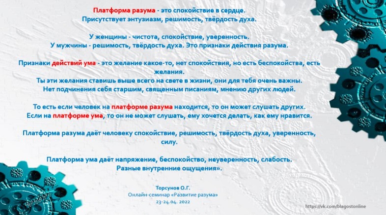 ПЛАТФОРМА РАЗУМА - это спокойствие в сердце. Присутствует энтузиазм, решимость, твёрдость духа. У ЖЕНЩИНЫ- чистота, спокойствие, уверенность. У МУЖЧИНЫ - решимость, твёрдость духа. Это признаки действия разума. ПРИЗНАКИ ДЕЙСТВИЙ УМА - это желание какое-то, нет спокойствия, но есть беспокойства, есть желания. Ты эти желания ставишь выше всего на свете в жизни, они для тебя очень важны. Нет подчинения себя старшим, священным писаниям, мнению других людей. То есть если человек на платформе разума находится, то он может слушать других. Если на платформе ума, то он не может слушать, ему хочется делать, как ему нравится. Платформа разума даёт человеку спокойствие, решимость, твёрдость духа, уверенность, силу. Платформа ума даёт напряжение, беспокойство, неуверенность, слабость. Разные внутренние ощущения.