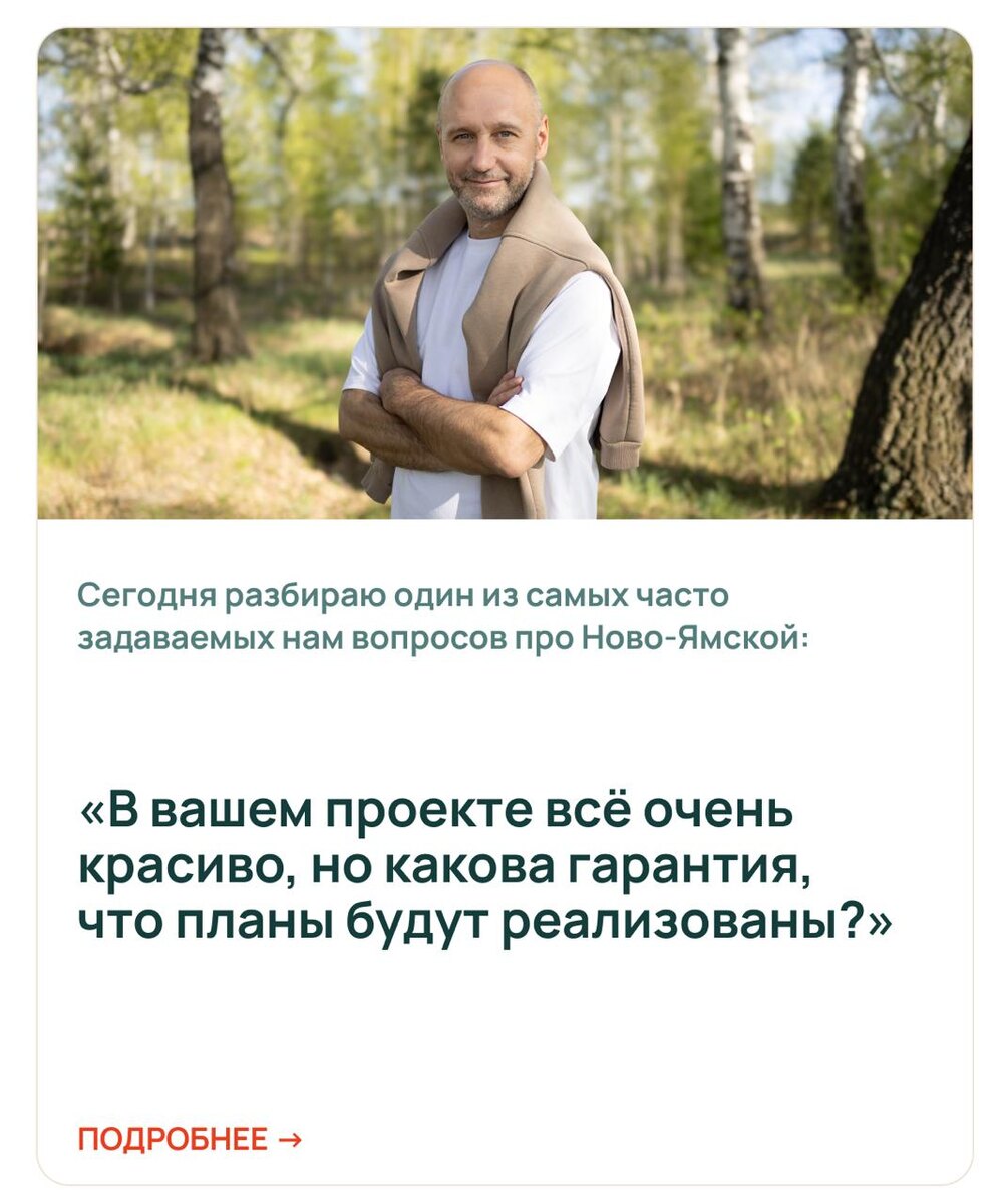 «В вашем проекте всё очень красиво, но какова гарантия, что планы будут реализованы?» Проектом «Ново-Ямского» предусмотрено не только благоустройство, создание детских и спортивных площадок, парковых территорий, но и целый комплекс коммерческих и социальных объектов. Исполнение обязательств гарантировано в первую очередь договором комплексного развития территории. Подробности в посте 👆🏻 Сейчас мы уже работаем над проектом ФОКа – будем строить спортивное сооружение и плоскостной стадион. Идет работа и над торговым центром, который станет точкой притяжения для всей Пивоварихи. Также мы взяли на себя проектирование школы и детского сада – эти проекты передадим в муниципалитет для проведения аукционов и строительства. А пока социальные объекты «Ново-Ямского» строятся, у жителей будет возможность пользоваться действующей инфраструктурой Пивоварихи. Здесь отличная новая школа (работает школьный автобус), детская школа искусств, дом культуры, хоккейный клуб. «Ново-Ямской» – проект, кот