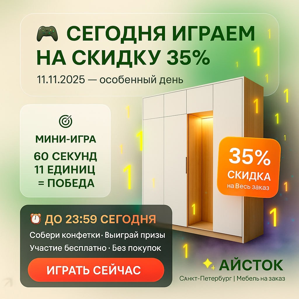 🎮 СЕГОДНЯ ИГРАЕМ НА СКИДКУ 35%! СКИДКА ГОДА! 11.11.2025 — особенный день в мире скидок Мы сделали игру, где можно ВЫИГРАТЬ скидку. 🕹 КАК ЭТО РАБОТАЕТ: 1. Переходишь на промостраницу 2. Играешь в мини-игру "Поймай единицу" (60 секунд) 3. Собираешь 11 единиц из падающих цифр 4. ВЫИГРЫВАЕШЬ скидку 35% на весь заказ Это реально работает. Это весело. Это только сегодня. 🎯 ЧТО ДАЁТ ПОБЕДА: ✓ СКИДКА 35% на любой заказ ✓ Бесплатный замер + 3D-проект ✓ Фурнитура с доводчиками в подарок ✓ Замер в течение недели (до 18.11) ✓ Скидка фиксируется на 10 дней ⚠️ ВАЖНО: Мест всего 11. Кто первый выиграл - того и скидка. Сыграть можно сколько угодно раз. Но записаться только один. 💡 НЕ ПОЛУЧИЛОСЬ ВЫИГРАТЬ? Не беда! Держи промокод 11ВЫГОДНО11 на скидку 15% 🎮 ИГРАТЬ ПРЯМО СЕЙЧАС: https://айсток.рф/1111 Акция до 23:59 сегодня. Успей сыграть! АЙСТОК | Санкт-Петербург Где скидки можно выиграть, а не выпросить 😎