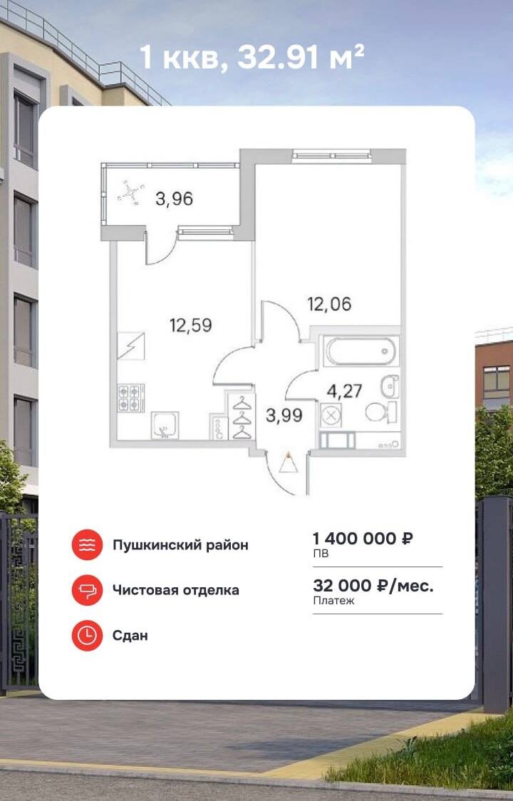 Готовая квартира в ЖК на границе Московского и Пушкинского районов. В 10 минутах — «Экспофорум», в 15 минутах — аэропорт. Это кварталы комфорт-класса для комфортной семейной жизни, где предусмотрены: школа, детские сады, педиатрическое отделение по ОМС и даже собственный парк «Олимпийские надежды». Траншевая ипотека — это удобный способ купить квартиру выгодно. Студия 25,88 • ПВ — 1 100 000 ₽ • платеж в первый год — 25 000 ₽/мес. 1 ккв, 32.91 м² • ПВ — 1 400 000 ₽ • платеж в первый год — 32 000 ₽/мес.