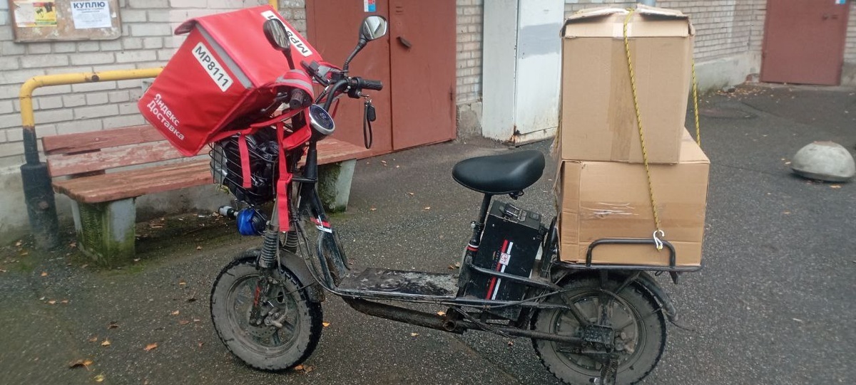 А это моя рабочая лошадь. Запечатлена в момент форс-мажорного заказа... Это такая нередкая ситуация, когда очень умная система Яндекс посылает велокурьера туда, где однозначно нужен автокурьер. Здесь - были две коробки с игрушками, с трудом помещающиеся на багажник...