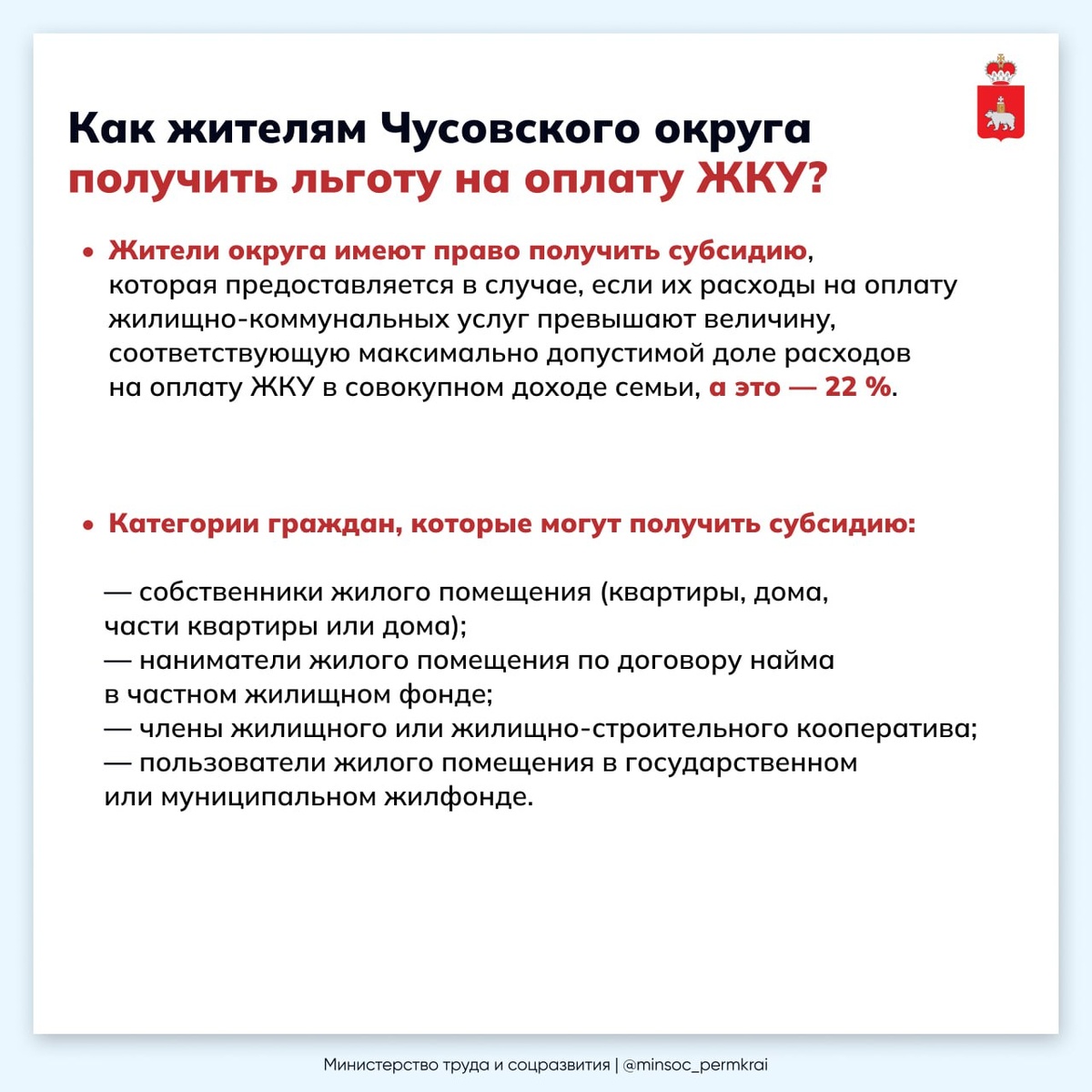 Как жителям Чусовского округа получить льготу на оплату ЖКУ? • Жители округа имеют право получить субсидию, которая предоставляется в случае, если их расходы на оплату жилищно-коммунальных услуг превышают величину, соответствующую максимально допустимой доле расходов на оплату ЖКУ в совокупном доходе семьи, а это — 22 %. • Категории граждан, которые могут получить субсидию: — собственники жилого помещения (квартиры, дома, части квартиры или дома); — наниматели жилого помещения по договору найма в частном жилищном фонде; — члены жилищного или жилищно-строительного кооператива; — пользователи жилого помещения в государственном или муниципальном жилфонде. • Для следующих категорий граждан допустимая доля расходов на оплату ЖКУ в совокупном доходе составляет 18 %: — одинокие родители, имеющие на воспитании одного и более несовершеннолетних детей; — неработающие одиноко проживающие пенсионеры по старости, не имеющие права на льготы по оплате ЖКУ; — семьи, состоящие только из неработающих