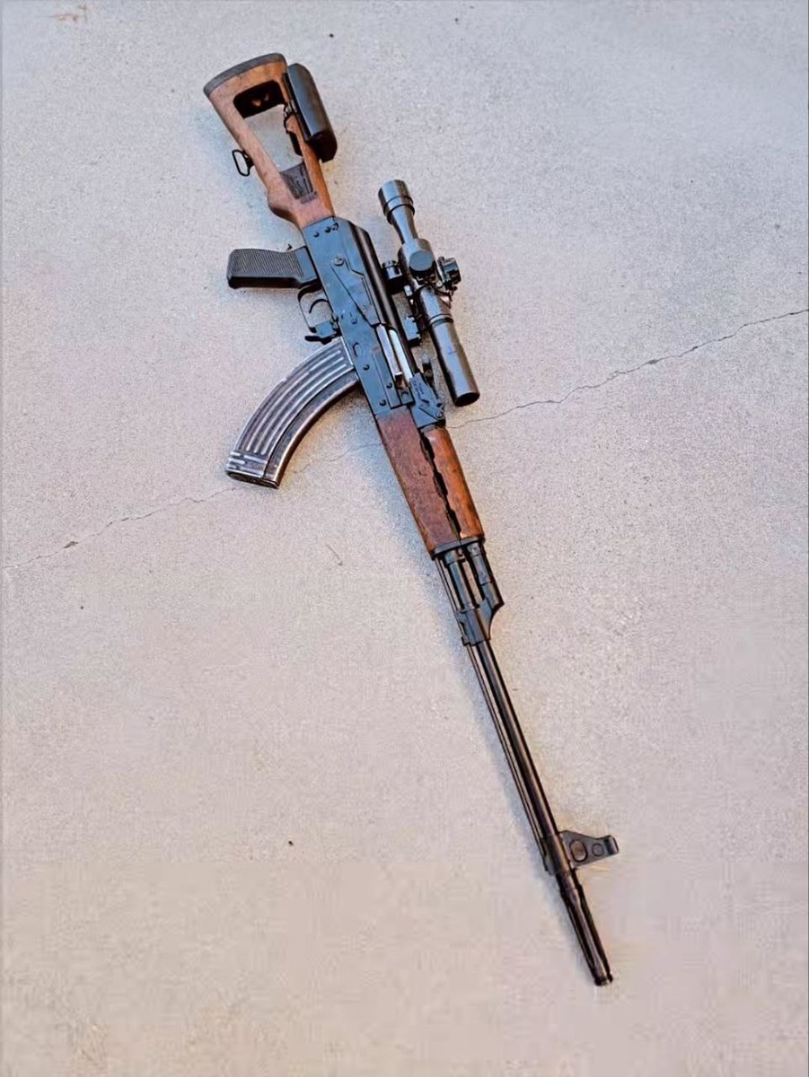 Немного о необычных генерациях платформы АК, и поделок на базе этих генераций. Перед вами иракская снайперская винтовка Tabuk (сильно модифицированная югославская Zastava M70B1) с 600-мм стволом и магазином на 30 патронов 7,62х39 мм "Табук" - это длинноствольный вариант югославского ручного пулемета M72, произведенный на заводе Al-Qadissiya к северу от Багдада. Само решение использовать один из самых распространенных боеприпасов в качестве снайперского, довольно неожиданное и оригинальное, но и не самое лучшее. По упоминаниям об использовании можно говорить о том, что реальная эффективная дальность использования такой винтовки не превышает 400 метров, что для такого типа оружия мягко говоря ни о чём. Почему было принято решение об использовании данного прототипа для иракских марксманов, остаётся загадкой. Хотя можно было просто скопировать ту же "Заставу" М76 под патрон 7.62х54 и получить полноценную винтовку, если уже сильно хочется сделать что-то похожее на СВД.