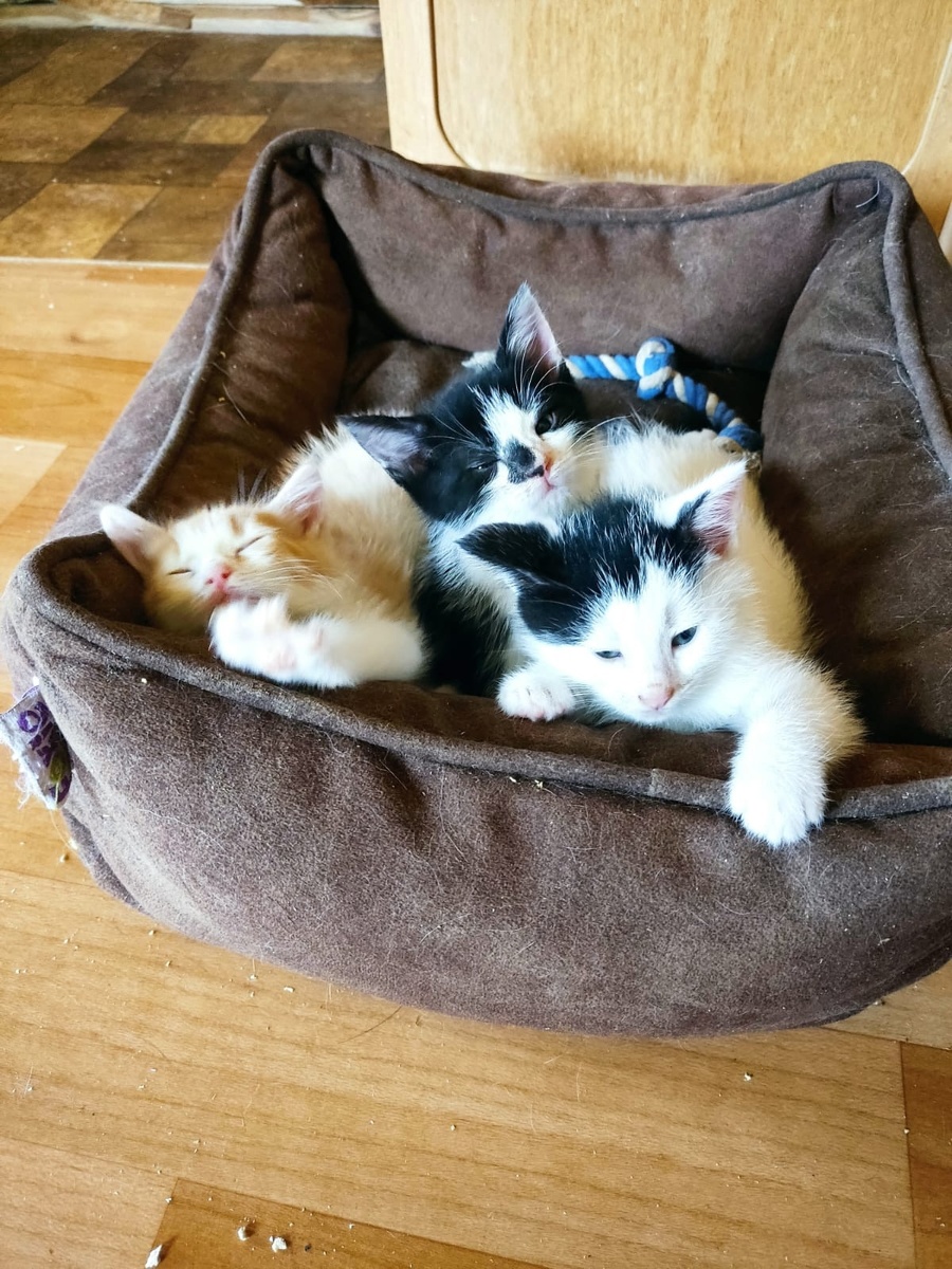 Некоторые люди считают, что жизнь на природе - рай для кошки. Это не совсем так. Да, кошкам нравится свобода, некоторым нравится охота (как развлечение, а не основная пища), но мы с вами знаем, что самовыгул - опасен. Да, в деревнях многие кошки гуляют сами по себе, при этом у них есть любящие хозяева, которые до конца не понимают (или не хотят понимать) всех рисков. Но есть такая отдельная категория загородной жизни, как ферма. Почему-то, бытует мнение, что жизнь на ферме - лучшее, что может быть для животных-компаньонов, но, зачастую, животных там слишком много, они не стерилизованы, больны и голодны. НЕ ВЕЗДЕ, наверняка. За всех ничего говорить не могу, но на известных мне - так. Этих малышей забрали с одной из таких ферм. Хозяин выставил коробку с ними подальше (по непонятной причине), где они ели только молоко своей мамы. Когда крохи поступили к волонтерам, они еще не умели есть самостоятельно, хотя по возрасту уже должны были. Малыши были больные и очень голодные, ведь им было у