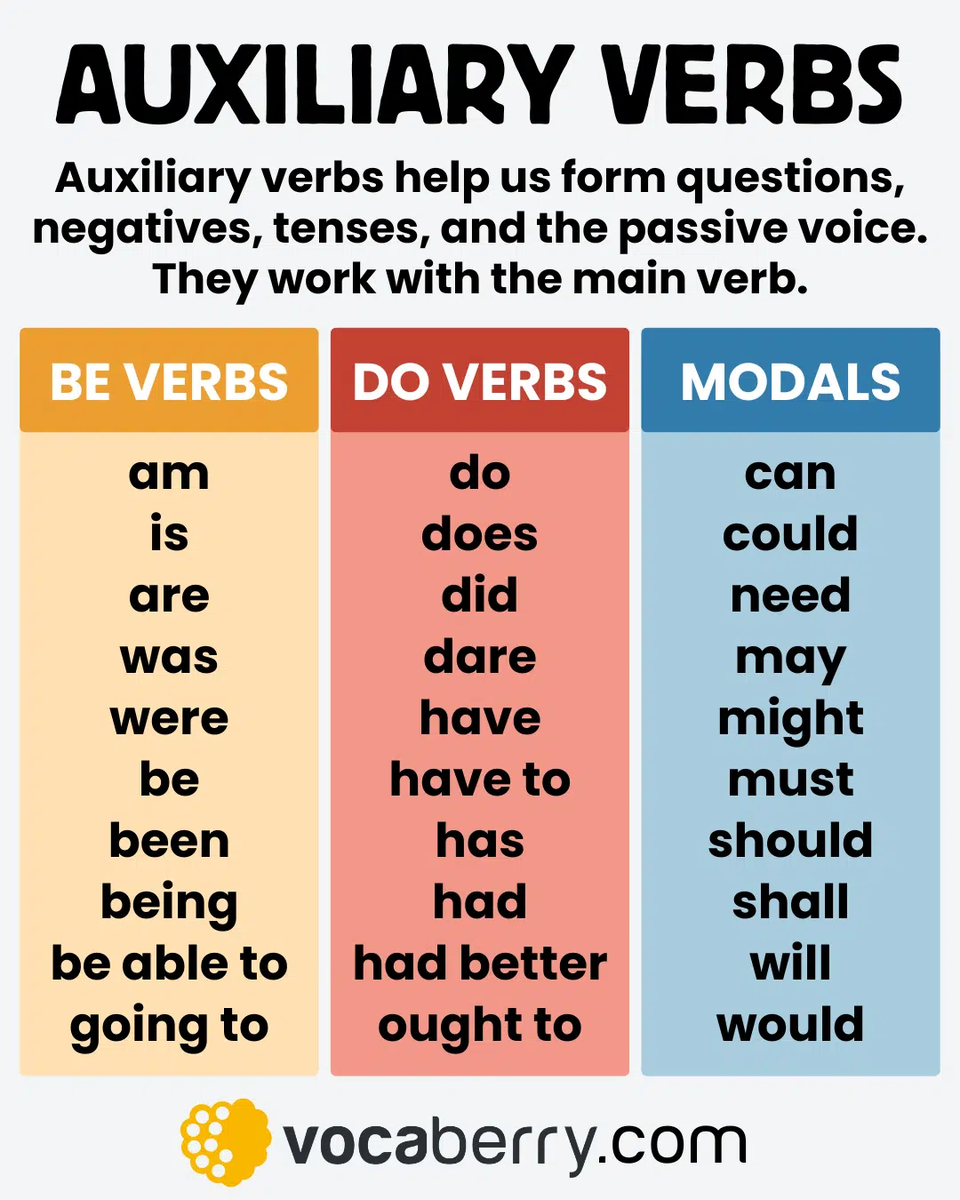 Auxiliary verbs (also called helping verbs) are essential in English grammar. They don’t show meaning by themselves but support main verbs to form verb tenses, questions, negatives, and the passive voice. Common auxiliary verbs include be, do, and have, as well as modal verbs like can, will, and must.