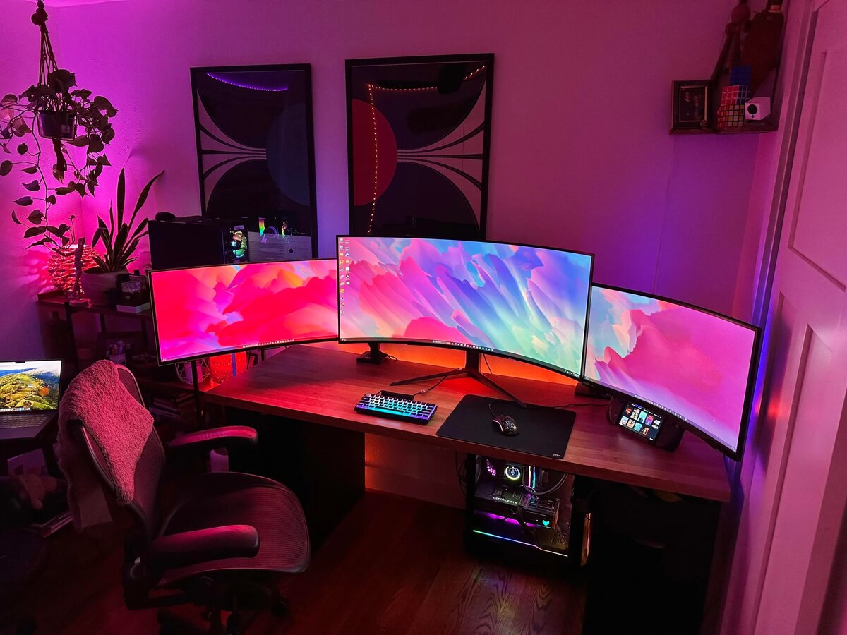 Монитор LG UltraGear 45GR95QE-B — это профессиональный изогнутый OLED-дисплей с диагональю 44.5″, разрешением 3440×1440 (WQHD) и соотношением сторон 21:9, который сочетает высокую частоту обновления, потрясающее качество изображения и продуманную эргономику. Он идеально подходит для киберспорта, графического дизайна, работы с мультимедиа и просто для пользователей, которые ценят комфорт и максимальное погружение. Монитор выполнен в цветовом решении, которое производитель называет «Фиолетовый серый». Мы охарактеризуем его как темно-темно-серо-синий с разнообразной текстурой корпуса: RGB-подсветка на вставках задней панели и нижнем торце подсвечивается одним цветом, который можно выбрать или задать режим медленной циклической смены цвета через меню. Монитор установлен на надежную подставку с алюминиевыми и стальными несущими элементами. Конструкция подставки продумана для удобства и устойчивости: Монитор можно легко снять с подставки и закрепить на VESA-кронштейне 100×100 мм, что делает