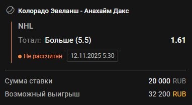 🏒🏒🏒🏒🏒 🏔Колорадо - 🦆Анахайм Две самые результативные команды лиги на данный момент, связка "Эвеланш" Маккиннон-Макар в огне, 13 очков на двоих за крайние 2 игры, а Анахайм вообще бешеный, 7 побед подряд и 4.2 шайбы в среднем за игру по сезону, кайфую с их атаки. Между собой команды исторически играют весело, а в такой форме как сейчас и подавно. Жду яркую игру. Прогноз: Тотал больше 5,5