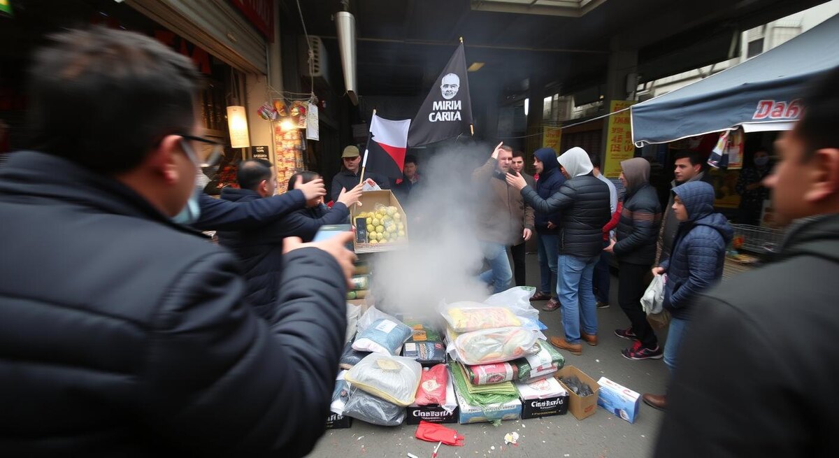 Секунда — и накал достиг пика. Девушка в худи пытается увести парня, у которого дрожат руки: «Пойдём, хватит, мы не для этого пришли». Позади них — мужчина, прижавший к груди коробку с товаром, повторяет по-русски с заметным акцентом: «Не ломайте, я всё оплачу, не надо!» Между рядами начинают хлопать петарды — кто-то решил “поддать шума”. Люди шарахаются, матерятся, закрывают уши. В воздухе — запах дешёвых фейерверков и пролитого кофе из соседней точки. Пожилая продавщица семечек плачет и шепчет: «Господи, да кому вы что докажете этим?» Пара невысоких парней отступают к выходу, но тут же возвращаются, будто боясь «сдаться», — у них на телефонах уже идёт трансляция.