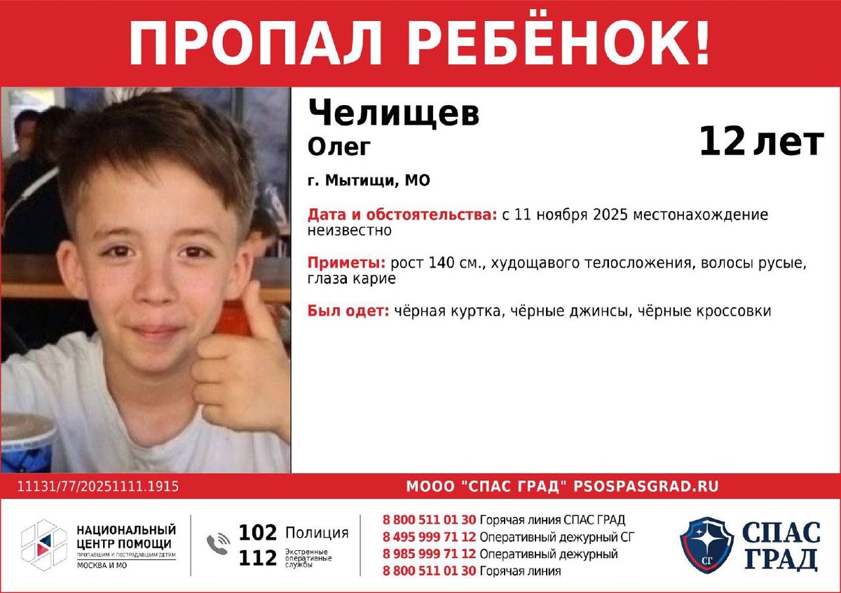 ✅ МАЛЬЧИК НАЙДЕН! 🔴 ПРОПАЛ РЕБЁНОК‼️ ▪️ЧЕЛИЩЕВ ОЛЕГ, 12 ЛЕТ ➡️11 ноября 2025 года в Мытищах мальчик ушёл и до настоящего времени не вернулся. ▪️ Приметы: рост около 140 см, худощавого телосложения, волосы русые, глаза карие. ▪️ Был одет: чёрная куртка, чёрные джинсы, чёрные кроссовки. ‼️ Просим вас максимально распространить информацию, чтобы помочь найти Олега и вернуть его домой. Не поленитесь сделать репост в ваши домовые и школьные чаты. Каждый репост может стать решающим шагом в поиске! 🙏 📣 Если вы что-то знаете или видели ребёнка, пожалуйста, свяжитесь по телефонам: • 8 (926) 050-88-30 — Людмила • 8 (925) 365-18-05 — Кристина • 8 (495) 999-71-12 — оперативный дежурный «СпасГрад» ❤️ @mytischi_live | прислать новость 📲 Мы в MAX
