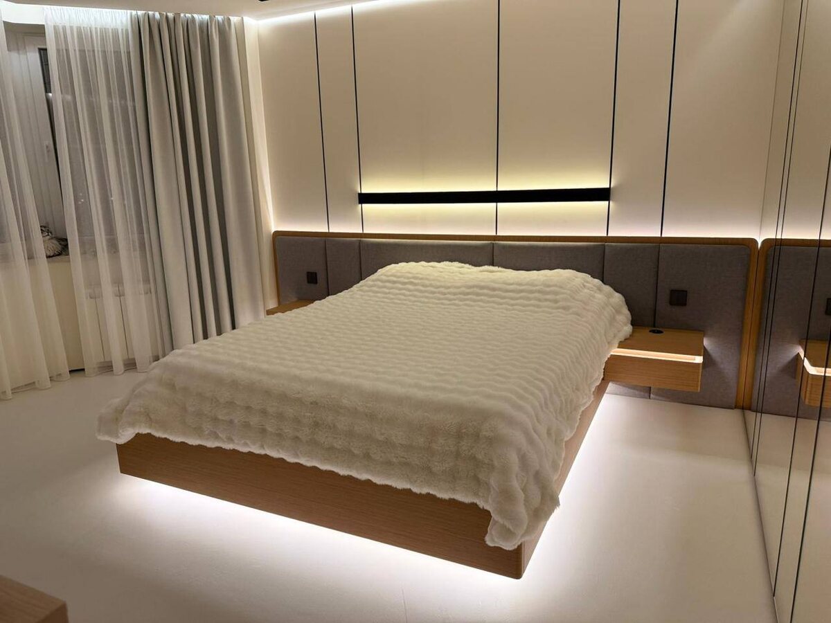 Wow 🤩 Кровать по эксклюзивному проекту из шпона дуба для наших заказчиков. Изголовье мягкие тканевые панели. Визуально парящая конструкция. Подсветка особенно подчеркивает этот эффект. Особенностью являются скругленные углы деталей. Что конечно добавляет комфорта. В подвесных тумбах выдвижные ящики и встроенные зарядные станции для телефонов.