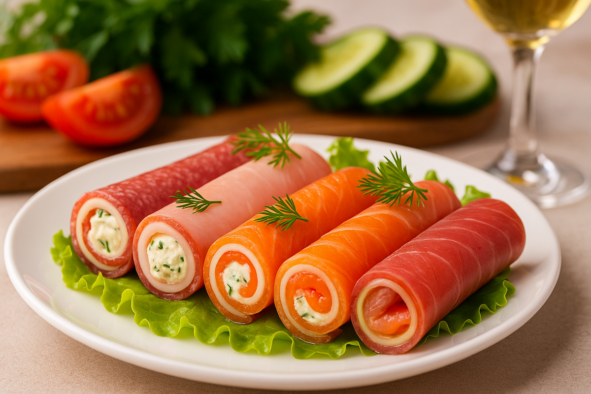 Тонкие ломтики мясного деликатеса и три совершенно разные начинки: сливочная, свежая и пряная. Эти рулетики выглядят дорого, собираются за 20 минут и становятся первыми, кто исчезает с тарелки. Калорийность на 100 г: 214 ккал Белки: 12,4 г Жиры: 17,3 г Углеводы: 2,9 г Ингредиенты (на 15–18 рулетиков): Ингредиенты: Приготовление: Перец нарезать мелкими кубиками, чеснок пропустить через пресс, смешать с сыром и перцем. Получается ароматная кремовая масса. На ломтик сервелата выложить чайную ложку начинки и свернуть плотным рулетиком. При желании зафиксировать шпажкой. Ингредиенты: Приготовление: Огурец натереть на мелкой тёрке, слегка отжать. Добавить сметану, мелко рубленую мяту и лук. Перемешать до кремовой консистенции. На ломтик карбоната выложить ложку начинки, свернуть в рулет и убрать в холодильник на 10-15 минут, чтобы схватилось. Ингредиенты: Приготовление: Фасоль размять вилкой до пасты. Добавить масло, лимон, измельчённую петрушку и чеснок. Перемешать. На ломтик сервелата