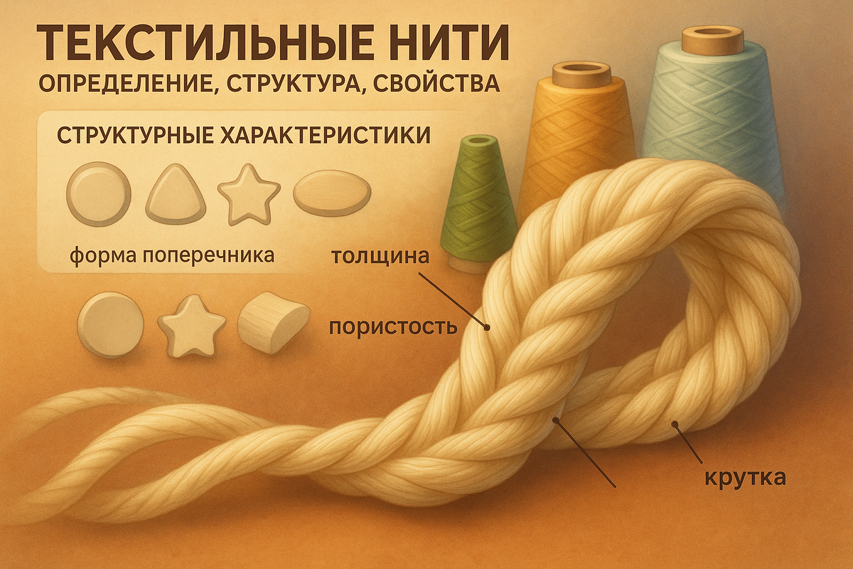 Текстильные нити – тонкие, гибкие тела неопределённо большой длины, получаемые из текстильных волокон (ГОСТ 13784-94 «Волокна и нити текстильные. Термины и определения»). Это промежуточный материал (полуфабрикат), предназначенный для производства тканей, трикотажа и других текстильных изделий. К структурным характеристикам относят: Толщина нити Толщину характеризуют площадью поперечного сечения, диаметром поперечника и линейной плотностью. Линейная плотность (Т) — это количество массы волокна в единице длины. Т=M/L, где Т — линейная плотность, текс; M — масса, г; L — длина, км. Зная текс, можно рассчитать метрический номер нити: N=1000/T. Форма поперечника нитей Форма поперечного сечения нитей (поперечника) оказывает значительное влияние на их внешний вид, свойства и поведение в процессе переработки. Круглое сечение — наиболее распространённое, обеспечивает равномерную прочность, гладкость и блеск поверхности. Многоугольное (треугольное, квадратное, пяти- или шестиугольное) — увеличива