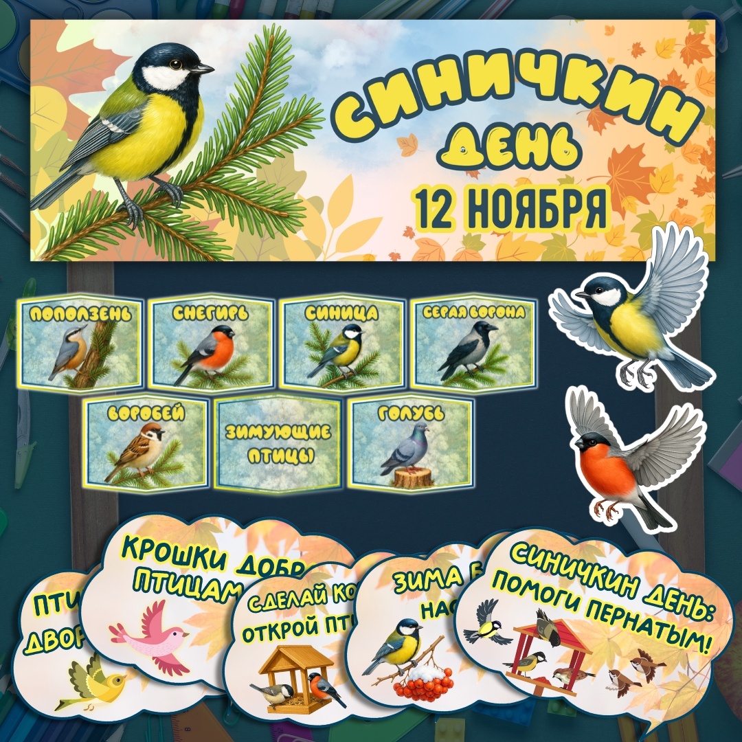 12 ноября — Синичкин день. Оформление кабинета, оформление доски. Идея набора — дать педагогу и организатору мероприятия быстрый, красивый и полностью готовый комплект для оформления класса, актового зала или мероприятия в школьной библиотеке. Материалы помогают рассказать детям о зимующих птицах, напомнить о важности подкормки их в холодный период года. Универсальный дизайн: тёплая палитра, аккуратные иллюстрации, крупная и читаемая типографика — всё хорошо видно на расстоянии. Готово к печати: оптимизировано под домашний и школьный принтер. Трансформируется под ваши задачи: гексы можно использовать как карточки для викторины, облачка — как задания или «говорящие» подписи к фотозоне, стикеры — для поощрения участников. Экономия времени: оформление собирается за 15–20 минут, не требует дополнительной верстки. Безопасные формулировки и доброжелательный тон — подходит для начальной и основной школы, детского сада и кружков. Кому пригодится: Классным руководителям 1–7 классов для проведен