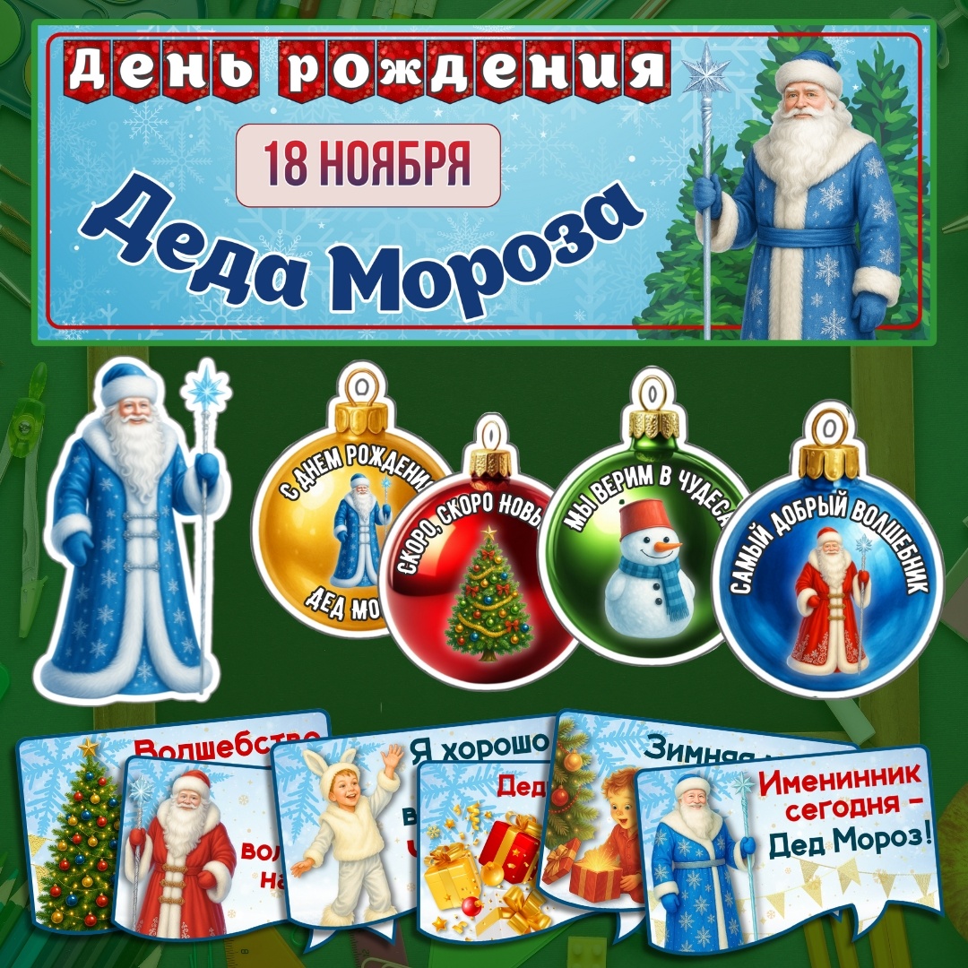 Оформление доски, кабинета ко Дню рождения Деда Мороза — 18 ноября. Идея набора — помочь педагогу быстро и красиво оформить класс, библиотеку, холл школы или группу в детском саду, создать атмосферу ожидания зимних чудес и одновременно дать детям добрый инфоповод: кто такой Дед Мороз, почему его день рождения отмечают в ноябре и как мы готовимся к Новому году. Преимущества: Готовность к печати: верстка под А4, поля под склейку баннера, контуры для удобной вырезки. Яркий дизайн. Модульность: используйте весь комплект или отдельные элементы — для стенда, фотозоны, утренника, квеста, поздравительного уголка у елки. Экономия времени педагога: оформление собирается за 10–15 минут, не требует дополнительной обработки и легко ламинируется. Этот комплект превращает обычный день в тёплый праздник ожидания чудес, создаёт фотогеничный фон, вовлекает детей в подготовку к Новому году и экономит ваше время.
