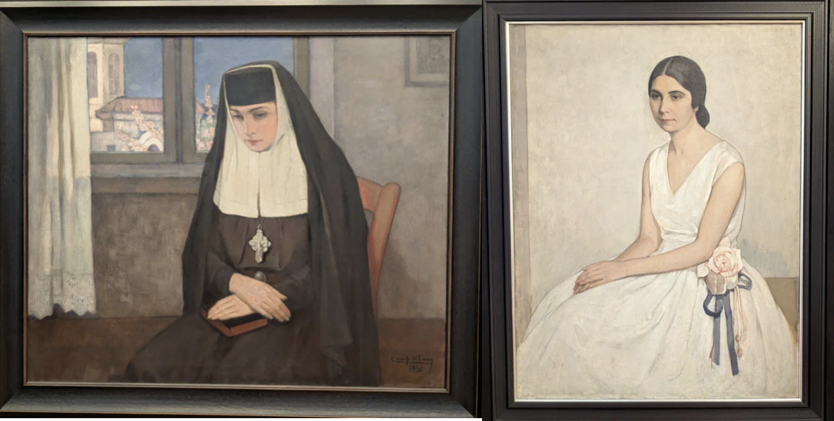 Эти две картины принадлежат перу одного болгарского художника - Стефана Иванова (1875–1951) Он был один из самых поэтичных болгарских живописцев начала XX века. В детстве он пережил смерть 6 из 12 братьев и сестер во время эпидемии, поэтому в его творчестве чувствуется меланхолия. Его картины проникнуты тишиной и светом, в них чувствуется глубокая человечность и мягкая грусть. Художник часто изображал женщин — задумчивых, погружённых в себя, в момент покоя и внутреннего размышления. Давайте сравним две картины: «Весна в монастыре» и «Портрет Доны Лазаровой» На обеих изображены молодые женщины. Их позы практически одинаковы- они сидят, опустив плечи и сложив руки на коленях. Но в остальном картины как бы являются фотографией и негативом - картина с монахиней - в темных тонах, картина с молодой девушкой - в светлых. Монахиня полностью покрыта, как ей и подобает по сану, мы видим только её лицо. Девушка - в легком платье с открытыми плечами и украшением в виде розы на поясе. Присмо