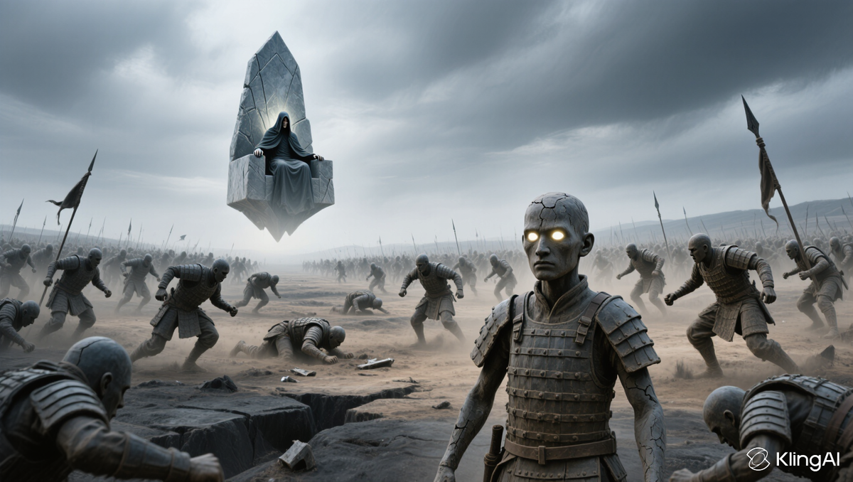 Оно было другим. Не из глины. Его облик был резким, угловатым, словно высеченным из твёрдого материала. Его темная оболочка не облегала тело, а была составлена из жестких форм: прямые линии плеч, высокий воротник, рассекающий воздух, и четкие прямоугольные складки на груди. Его тонкие пальцы, обтянутые той же темной материей, с раздражением били по ребристым подлокотникам трона. А там, где у солдат была лишь гладкая, безликая глина, у Существа располагался сложный, подвижный рельеф, обрамленный жестким, геометричным контуром. Сейчас этот рельеф был искажен и напряжен: горизонтальные выступы над глазами сдвинуты, вертикальная впадина между ними углубилась, а узкая линия внизу плотно сжалась. Существо смотрело на поле боя, и его Голос, знакомый и всеобъемлющий, звучал оттуда, из этой искаженной маски, и в нем слышалось не только приказание, но и чуждое чувство — острое напряжение, граничащее с яростью.