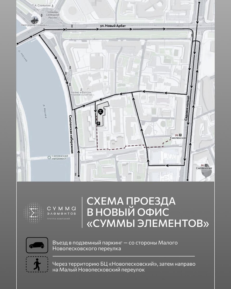 🔗 Мы переехали! Новый офис ГК «Сумма Элементов» расположен по адресу: Малый Новопесковский переулок, д. 8 — рядом с метро «Смоленская» и Смоленской набережной. ➡️ Заезд в подземный паркинг со стороны переулка, удобный подъезд как со Садового кольца, так и со Смоленской набережной. ➡️ Пешеходный маршрут: от метро через 1-й Смоленский переулок, затем — по территории БЦ «Новопесковский» и направо на Малый Новопесковский переулок. 📞 Чтобы попасть в здание, необходим пропуск и документ, удостоверяющий личность. Будем рады видеть вас в нашей новой штаб-квартире!