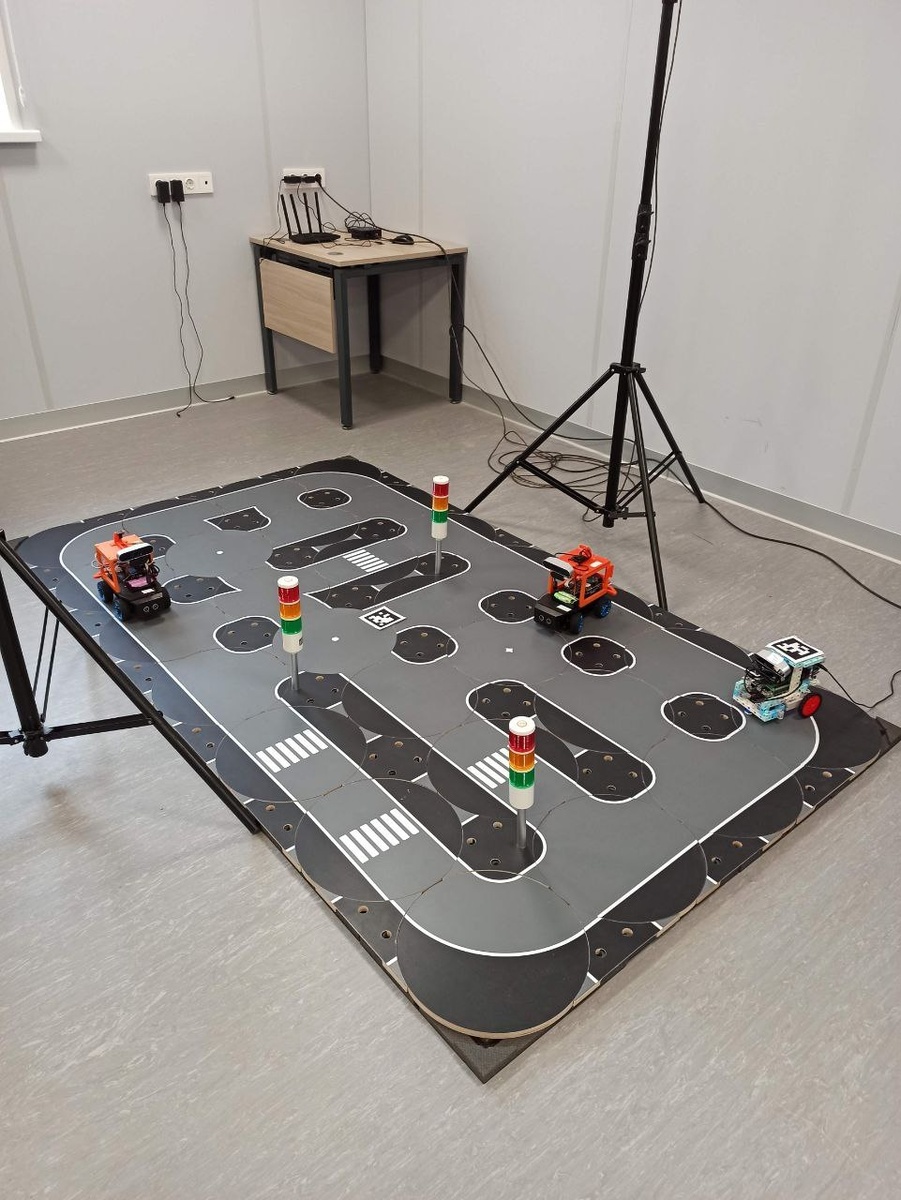 - мобильные роботы: два робота, собранные из деталей конструктора, выполняют роль автономных транспортных средств.