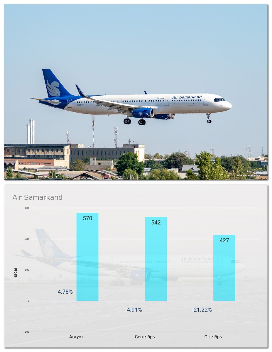 Итоги октября: Air Samarkand К середине октября из своих бортов в работе остался только UK32120, регулярных рейсов не осталось вообще. Выполняются только чартерные рейсы в Джидду, часть своими силами, а часть на Boeing 767 JY-JAL авиакомпании Jordan Aviation на условиях мокрого лизинга. Среднесуточный налёт на одно воздушное судно уменьшился ⬇️ на 23.84% и составил 4.35 часа. Суммарное количество часов налёта воздушных судов авиакомпании Air Samarkand за октябрь уменьшилось 🔽 на 21.22% по сравнению с сентябрём, и составило 427 часов. Общая динамика за последние 3 месяца представлена на графике. #статистика #airsamarkand #октябрь2025